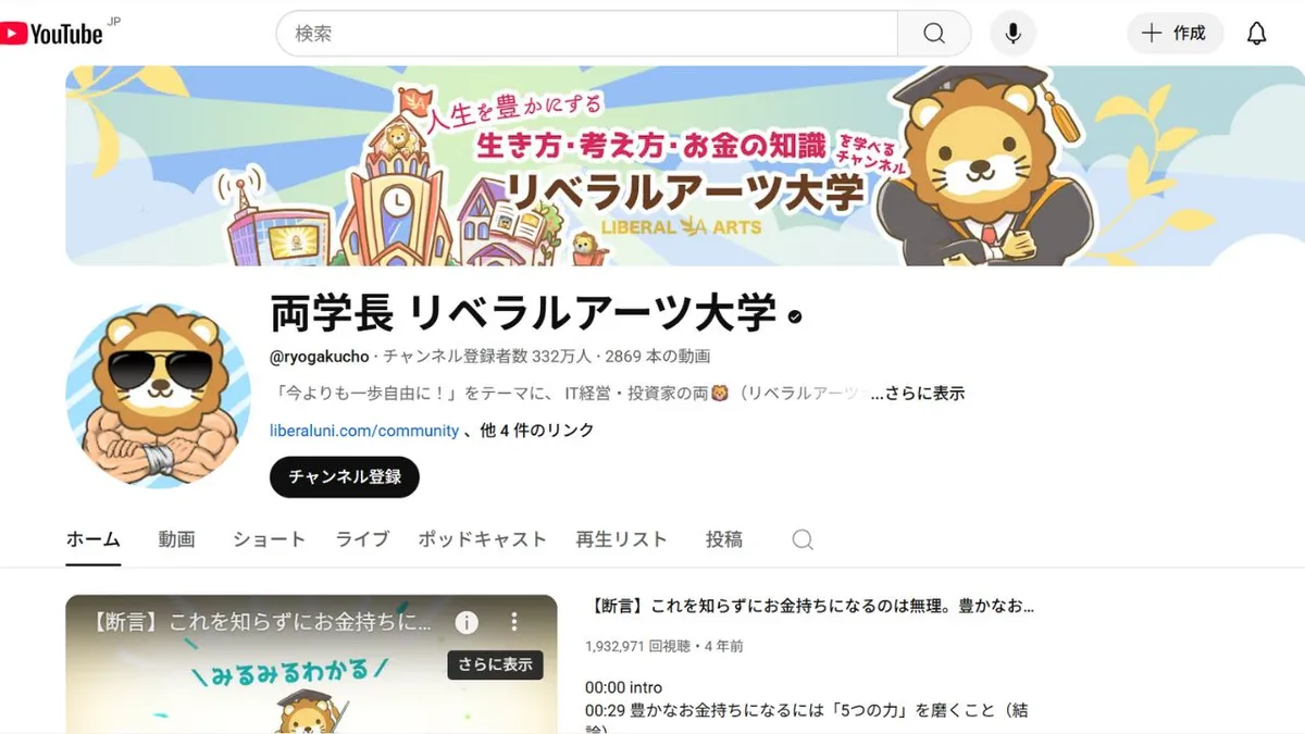 Liberal Arts University by Ryogakucho is one of Japan’s leading YouTube channels focused on money and life planning, launched in October 2018 by “Ryogakucho,” an IT entrepreneur and investor. The channel has amassed around 900 million total views and approximately 2.87 million subscribers. With the slogan “Take one step closer to freedom!”, it centers on five key money skills—saving, growing, earning, protecting, and spending—and provides beginner-friendly content on topics like saving tips, investing, and financial trends.