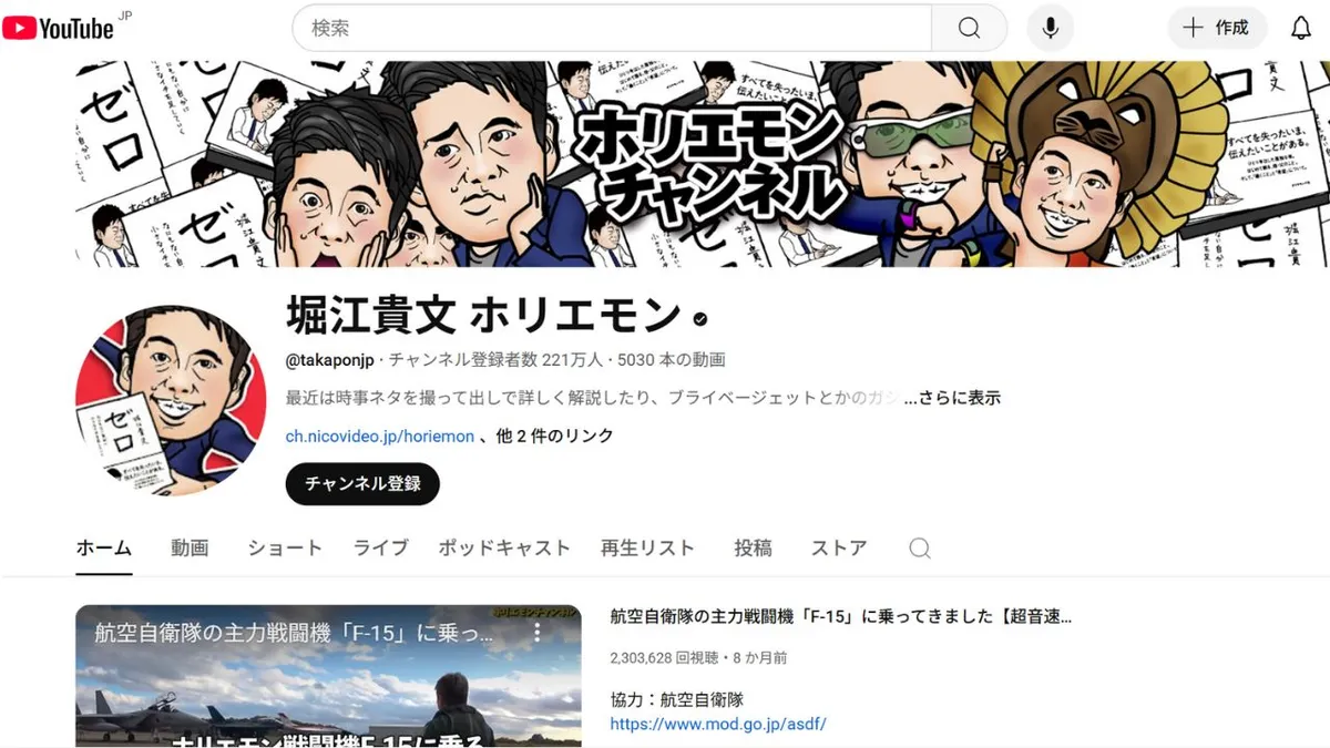 Source: Takafumi Horie (Horiemon) Official YouTube Channel (Approx. 2.2 million subscribers from September 2025)