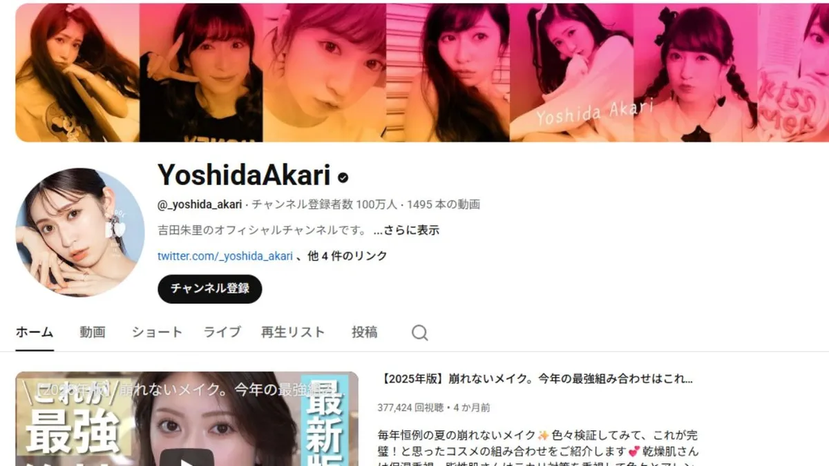 Akari Yoshida (also known as Akarin) is a Japanese tarento, model, and YouTuber. She is a former idol (former member of the Japanese idol girl group NMB48) and has a lifestyle/vlog presence where she often shares her daily life, fashion, and personal updates. Her background in modeling and entertainment gives her a polished presence and a strong public profile, helping her content stand out. As a public figure and former idol who has appeared in modeling and variety shows, her brand is established, and her lifestyle content appeals to followers who enjoy aspirational content.