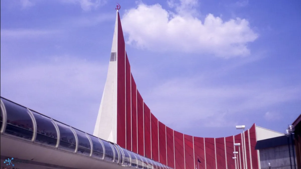 The 1970 Osaka Expo, themed "Progress and Harmony for Mankind," garnered significant attention with its Soviet Pavilion, which stood out for its innovative architecture and exhibits. The pavilion featured two main structures: an exhibition hall and a restaurant, characterized by a sharply protruding tower, curved roofs, and red and white exteriors. The space-themed exhibits, including a large model of the Vostok spacecraft and other space technology displays, were particularly popular.