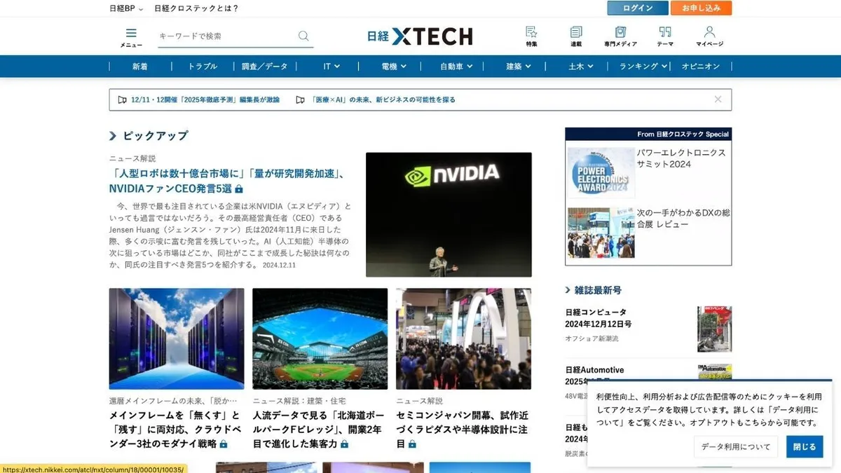 Nikkei XTECH, operated by Nikkei BP Inc., is a premier IT media platform renowned for its high-quality content designed to address the business challenges of IT engineers. The site focuses on the intersection of technology and business, offering comprehensive coverage of advanced technologies, electronics, automotive innovations, construction techniques, and medical advancements. With a mix of in-depth industry analysis and detailed explanations of emerging technologies, Nikkei XTECH serves as an important resource for staying informed about cutting-edge trends. Its specialized content makes it particularly suited for IT experts striving to stay ahead in their fields.
