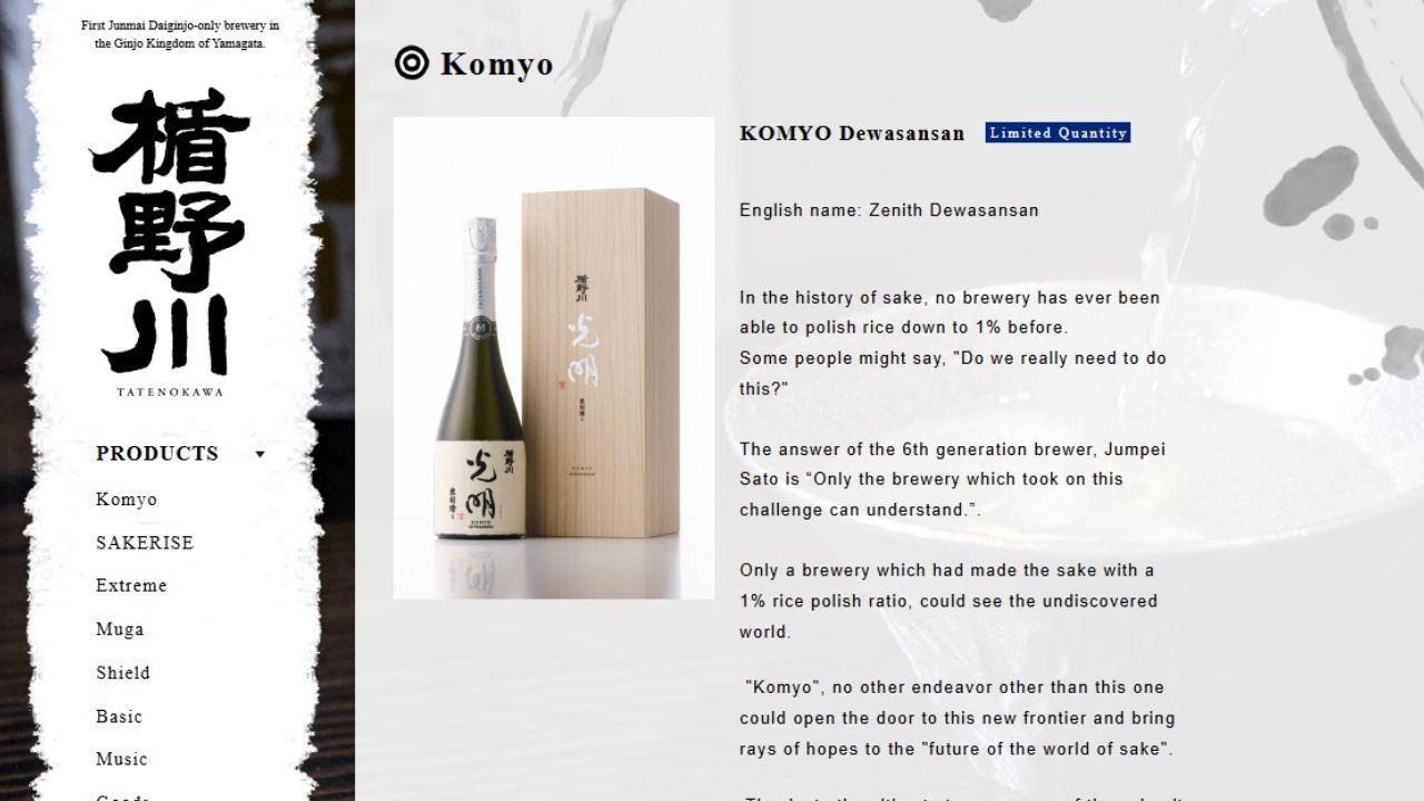 Tatenokawa Komyo, crafted in Yamagata Prefecture using 100% Dewasansan rice, is a revolutionary sake polished down to an astonishing 1%—a feat rarely seen in the world of brewing. This ultra-refined process produces a delicate, elegant sake with a soft floral aroma reminiscent of jasmine and a gentle, rounded sweetness on the palate. It truly showcases how far dedication and craftsmanship can elevate Japanese sake.