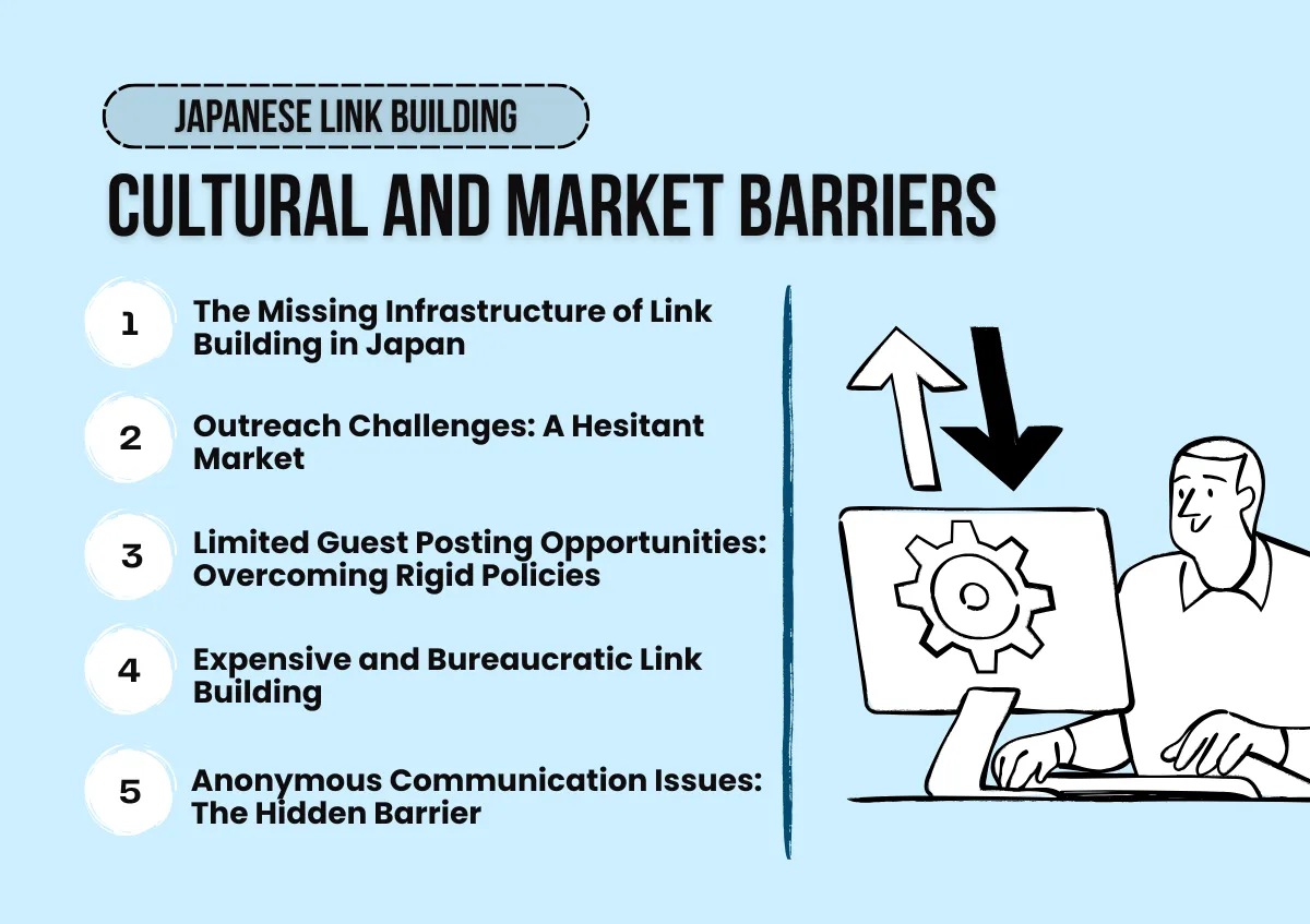 Beyond technical aspects, several cultural and structural factors complicate link building in Japan: