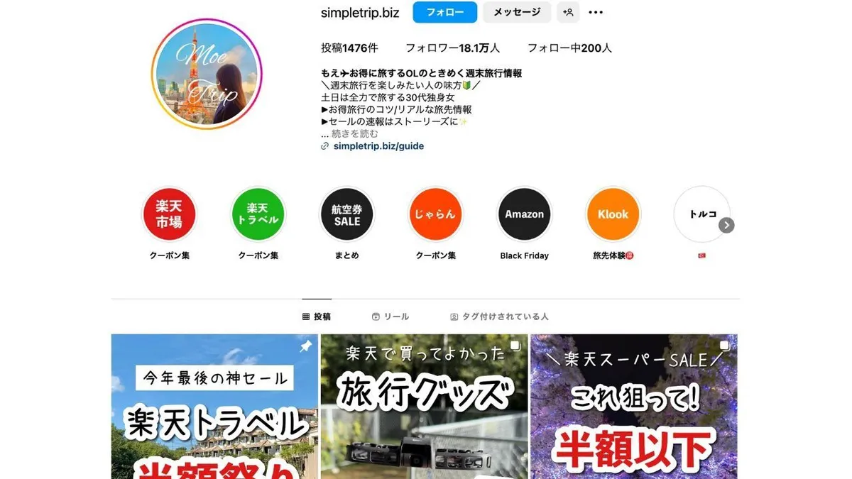 Moe’s travel experience is extensive, having visited all 47 prefectures in Japan and 27 countries abroad, with an impressive 80 stays per year. This wealth of experience allows her to share invaluable insights based on her personal journeys. Her account also focuses on helping followers save money through the Rakuten economic zone and Amazon Associates, where she regularly features useful coupons and campaigns. Her website, Simple Trip, lists additional coupons and accepts job requests, offering even more detailed information. Packed with resources, it is an excellent guide for enhancing weekend trips and also serves as an invaluable reference for short-term travel planning.