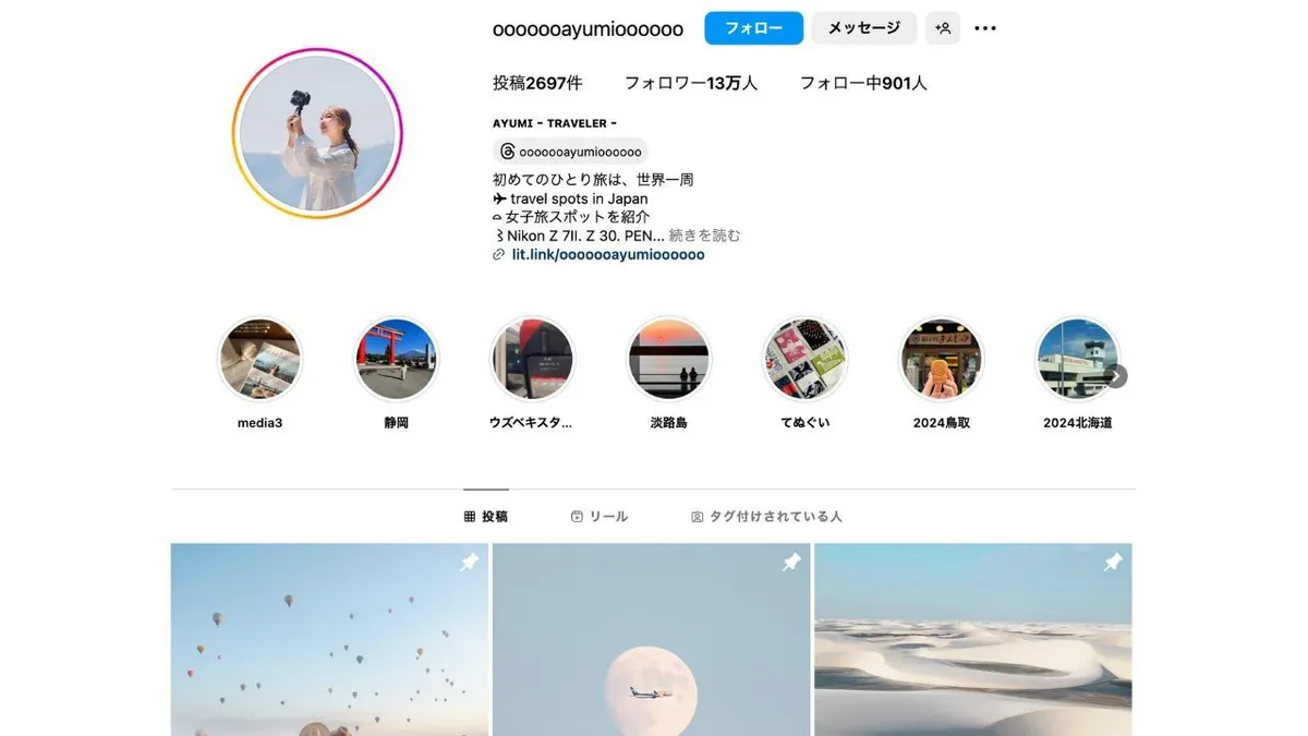 Ayumi's first solo adventure was a "round-the-world" trip, an experience she now uses to share captivating travel stories from both Japan and abroad. Through Instagram, she has gained a large following, captivating her audience with stunning travel photos and videos that highlight the beauty and allure of her journeys.