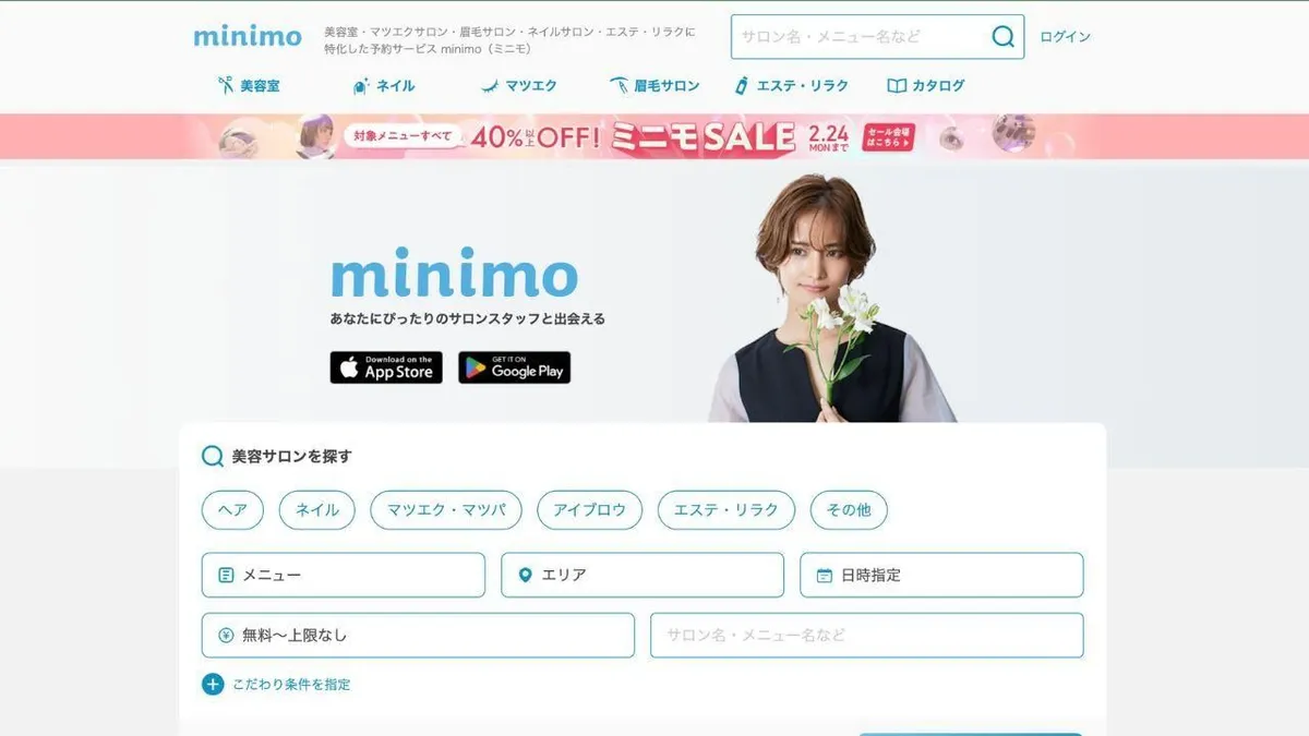 Minimo est l'application incontournable pourpassionnés de beautéVous recherchez des services professionnels à prix abordables ? Cette application vous permet de réserver des prestations auprès de professionnels de la beauté indépendants, tels que coiffeurs, prothésistes ongulaires, spécialistes des extensions de cils, esthéticiennes et bien plus encore, partout au Japon. Que vous souhaitiez explorer de nouveaux styles ou maintenir votre routine beauté, Minimo vous simplifie la vie à petit prix.