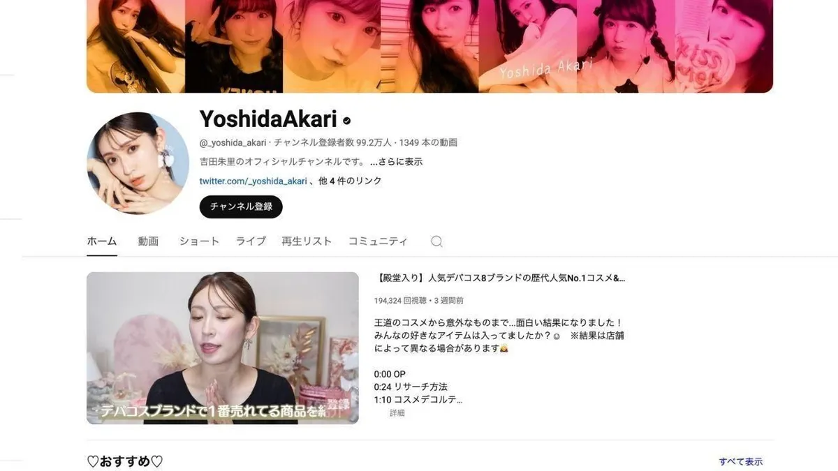 Akari Yoshida, ancienne membre du groupe NMB48, est désormais une YouTubeuse beauté. Ses vidéos abordent les techniques de maquillage, les conseils de soin de la peau et les idées de style. Forte de son expérience en maquillage acquise durant sa carrière d'idole, elle a également lancé sa propre chaîne YouTube.marque de cosmétiquesSon contenu séduit un large public, des débutants aux passionnés de beauté plus confirmés.