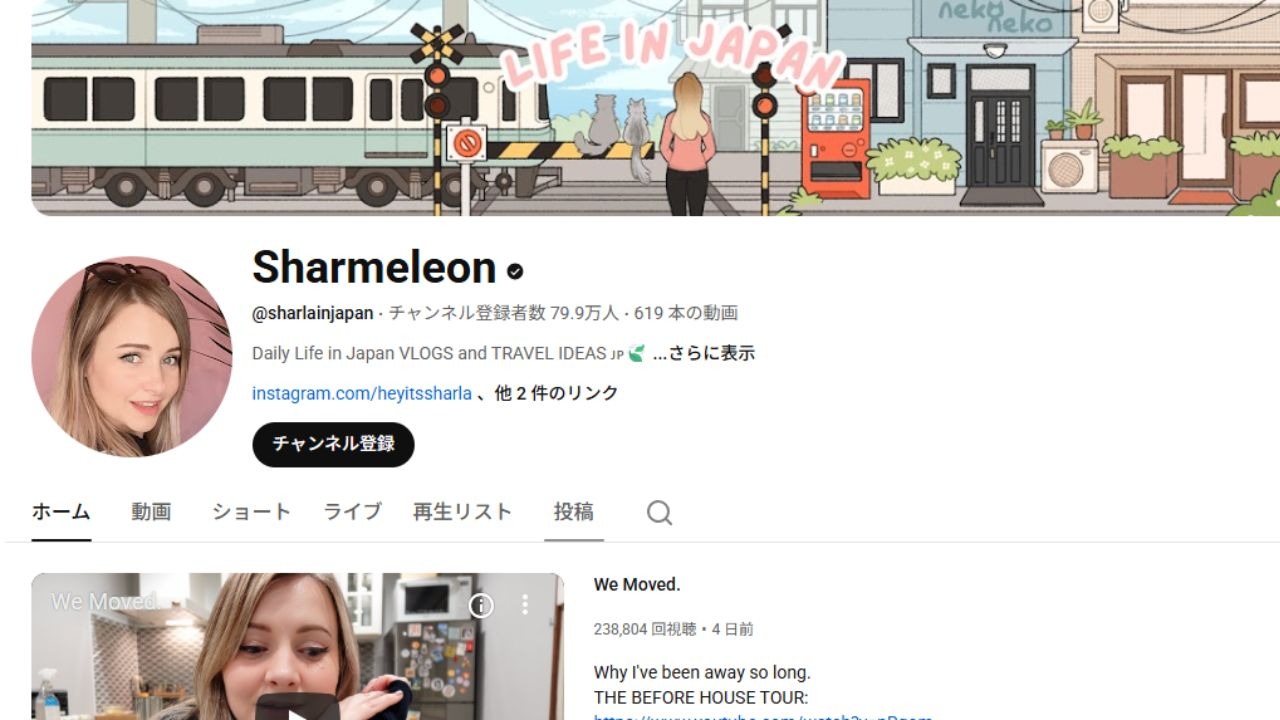Sharla, known as Sharmeleon, is a Canadian YouTuber residing in Japan who produces lifestyle, travel, and cultural content. She offers insights into daily life in Japan, exploring local customs, travel spots, daily routines, and cross-cultural perspectives. Because she has lived in Japan for a long time and speaks fluent Japanese, she bridges Japanese and foreign audiences, making her content accessible and engaging for both. Her content is polished, personal, and broad—covering travel, lifestyle exploration, and life in various Japanese locales—which makes her appealing for audiences interested in living or traveling in Japan.