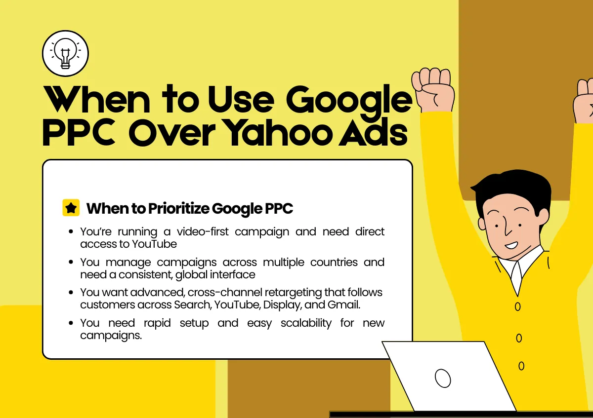 Google PPC est particulièrement efficace pour les campagnes gérées à l'international, axées sur le mobile et comportant une forte composante vidéo, offrant un niveau d'intégration et d'évolutivité que Yahoo Ads ne peut égaler.