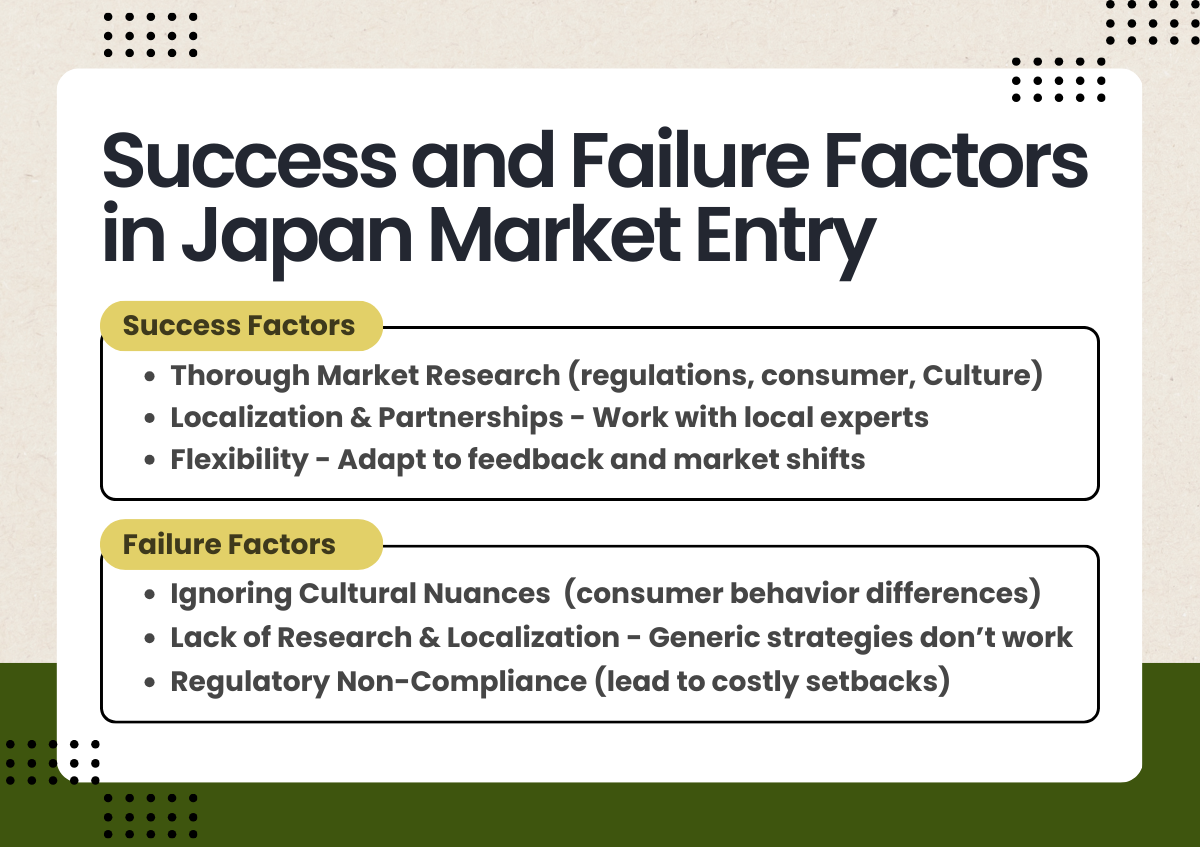 - Une recherche approfondie n'est pas négociable — Comprendre le comportement des consommateurs japonais, les forces de la concurrence et les exigences réglementaires constitue la base d'une entrée réussie.