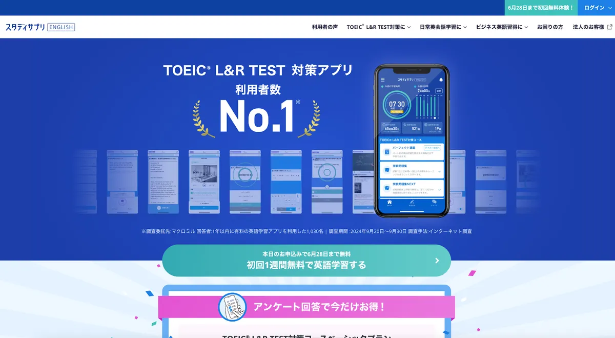 Study Sapuri ENGLISH est une application complète d'apprentissage de l'anglais développée par Recruit et largement utilisée par les étudiants et les enseignants.professionnels en activitéAu Japon, les options les plus populaires auprès des étudiants sont le « Cours de conversation quotidienne », qui enseigne les compétences d’écoute et d’expression orale à travers des scénarios de type théâtre, et le cours spécialisé de préparation au TOEIC.