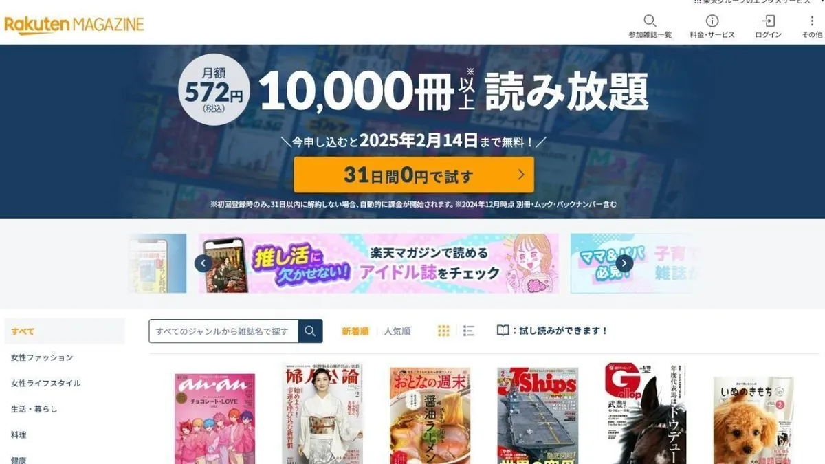 RakutenL'abonnement à Magazine offre un excellent rapport qualité-prix avec l'accès à plus de 8 000 magazines pour seulement 572 yens par mois. Les nouveaux utilisateurs peuvent bénéficier d'une offre spéciale.Essai gratuit de 31 joursCela leur permet de découvrir la plateforme avant de s'engager. Le service propose des abonnements mensuels et annuels, la formule la plus avantageuse étant proposée à un prix très abordable de 422 yens.