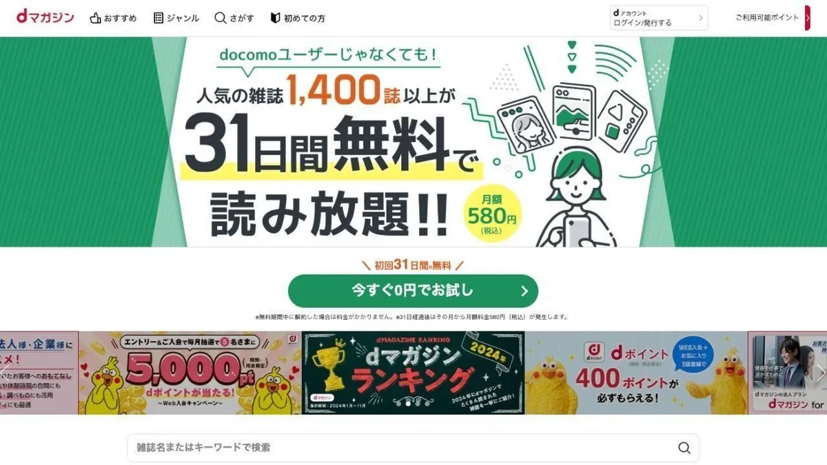 d Magazine, exploité par NTT Docomo, propose une large gamme de magazines, couvrant des genres allant de la mode aux voyages. La plateforme dispose d'une fonction de recherche performante qui permet aux utilisateurs deFiltrer le contenu en fonction de sujets d'intérêt spécifiques, y compris collections de recettesCette fonction intuitive améliore l'expérience utilisateur globale, facilitant la découverte et l'appréciation des contenus les plus récents, adaptés aux préférences individuelles.