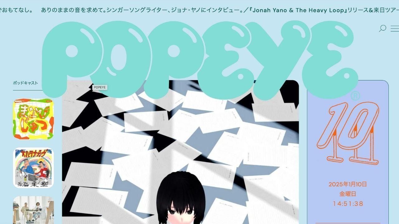 Popeye est un magazine élégant axé sur le style de vie « City Boy », s'adressant principalement aux hommes de 20 à 30 ans. Il propose une vision raffinée de la vie urbaine, abordant des sujets variés tels que la mode, la culture, l'art, la musique et les voyages. Grâce à son approche unique des tendances et à son design de haute qualité, Popeye captive les lecteurs passionnés par la culture urbaine contemporaine, devenant ainsi une ressource incontournable pour ceux qui souhaitent rester à la pointe de l'actualité.