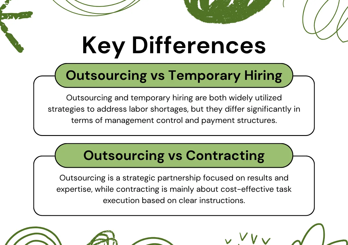 L'externalisation et le travail temporaire sont deux stratégies couramment utilisées pour pallier la pénurie de main-d'œuvre, mais elles diffèrent sensiblement en termes de contrôle de la gestion et de modalités de rémunération. Le travail temporaire, également appelé intérim ou « haken » (派遣) au Japon, consiste à recruter du personnel par le biais d'une agence d'intérim pour effectuer des tâches au sein de l'entreprise. Ces travailleurs sont placés sous la supervision et les instructions directes de l'entreprise et sont donc soumis à sa gestion interne. En revanche, dans le cadre de l'externalisation, l'entreprise externe prend en charge l'intégralité du processus de travail, l'entreprise cliente n'ayant plus à intervenir dans la gestion du personnel.