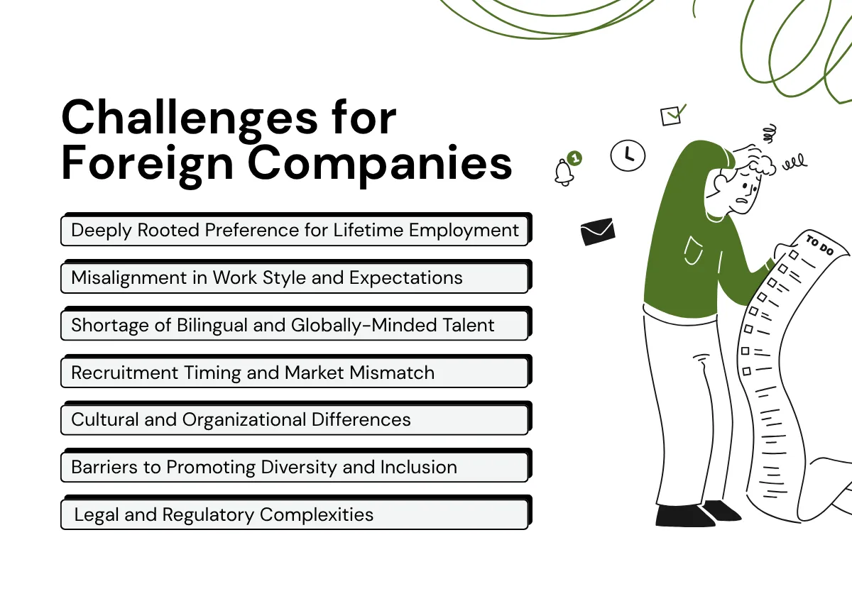 - Le marché de l'emploi japonais présente des défis particuliers pour les entreprises étrangères en raison des attentes liées à l'emploi à vie, des barrières linguistiques et de la rigueur de la législation du travail.