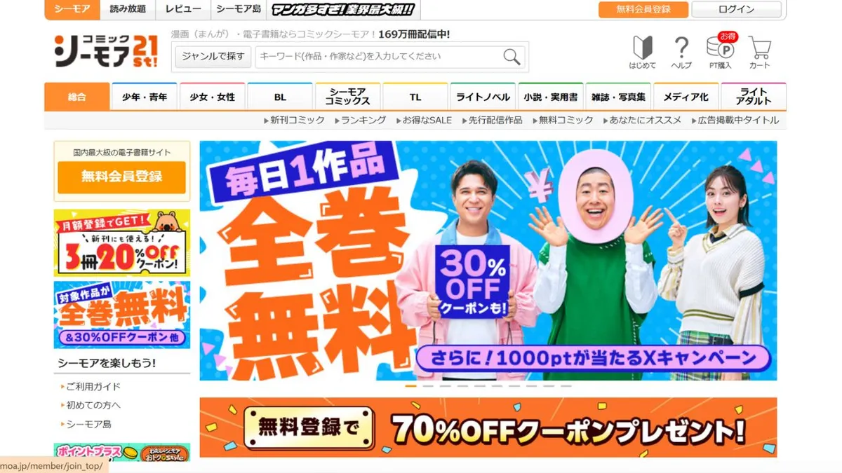 Comic CMOA, exploitée par NTT Solmare (membre du groupe NTT) depuis 2004, est une librairie numérique de confiance et bien établie. Avec un catalogue de plus de 1,1 à 1,4 million de titres et plus de 40 000 ouvrages gratuits, elle figure parmi les plus importantes du secteur, notamment grâce à sa riche offre de genres tels que le BL, le TL et les romans Harlequin, très appréciés des lectrices. Les utilisateurs peuvent choisir entre trois formules : paiement à l’unité, location ou accès illimité (Lite : 780 ¥/mois ; Full : 1 480 ¥/mois), avec un essai gratuit de 7 jours. De nombreuses promotions sont proposées, incluant des coupons de réduction de 70 % pour les nouveaux utilisateurs, jusqu’à 20 000 points de fidélité et des bonus pour la connexion à LINE ou la collecte de tampons de visite quotidiens. L’application et la version web permettent d’ajouter des signets, de créer des dossiers, de consulter le contenu hors ligne et de personnaliser les polices et les arrière-plans. Avec des avis de lecteurs, du contenu exclusif et en accès anticipé, et une interface conviviale, Comic SMOA est un service de livres numériques complet pour ceux qui recherchent variété et qualité.