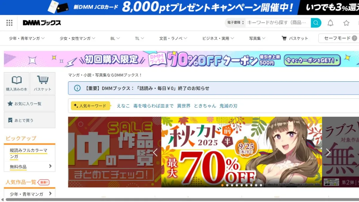 DMM Books est l'une des plus grandes librairies du Japon.plateformes numériquesCe service propose entre 980 000 et 1,26 million de titres, incluant bandes dessinées, romans, livres photo, ouvrages professionnels et contenus pour adultes. Avec plus de 20 000 titres gratuits, il est facile de découvrir le service. Des offres avantageuses, telles que des réductions de 70 à 90 % pour les nouveaux utilisateurs et de nombreuses promotions exceptionnelles avec un remboursement pouvant atteindre 100 %, en font une solution idéale pour les achats en gros.applicationCompatible avec les smartphones, les tablettes et les PC, cette application propose des fonctionnalités avancées telles que les signets, les marqueurs, la personnalisation des arrière-plans et des polices, le verrouillage des dossiers et l'accès hors ligne. Elle offre également un vaste choix de titres pour adultes via FANZA, un atout majeur. Bien qu'il s'agisse d'un service à la carte et non d'un abonnement, elle représente une excellente option pour les utilisateurs de DMM grâce au partage des points au sein de l'écosystème DMM.