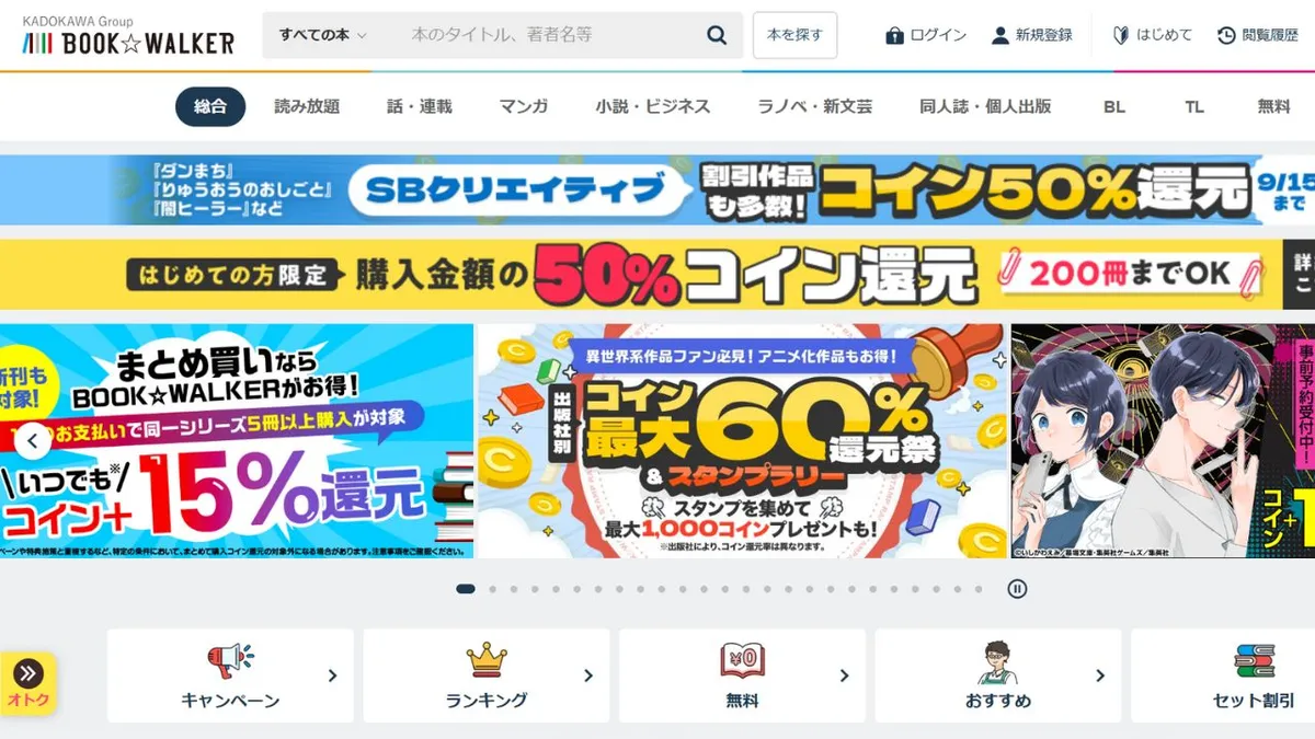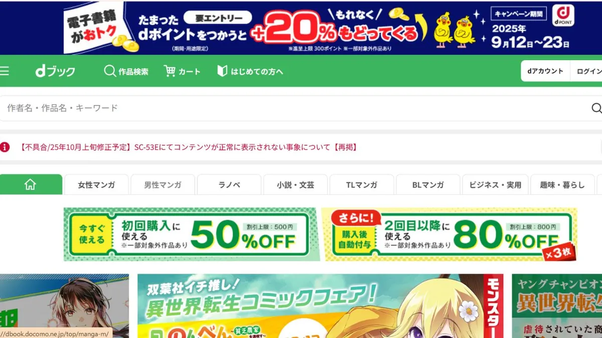 dBook est une librairie numérique proposée par NTT DOCOMO, offrant plus de 600 000 mangas, romans, magazines, guides pratiques et livres photo, disponibles à l'achat unique. Aucune inscription n'est requise et plus de 3 000 titres sont disponibles en aperçu gratuit. Les utilisateurs gagnent 1 dPoint pour chaque tranche de 100 ¥ dépensés, et les utilisateurs de DOCOMO peuvent obtenir jusqu'à 3 % de remise avec les paiements effectués par carte d. Les « Journées dBook », les 10, 20 et 30 de chaque mois, offrent un remboursement de 20 % en points. Les nouveaux utilisateurs reçoivent un coupon de réduction de 50 %, et les utilisateurs réguliers peuvent bénéficier de réductions allant jusqu'à 80 %, ce qui en fait une solution idéale pour tester la plateforme. La consultation hors ligne est possible.applicationCe service est idéal pour la lecture nomade. Grâce à la fiabilité de DOCOMO, il convient parfaitement à ceux qui souhaitent acheter uniquement ce qu'ils lisent et aux utilisateurs qui cumulent activement des « dPoints ».