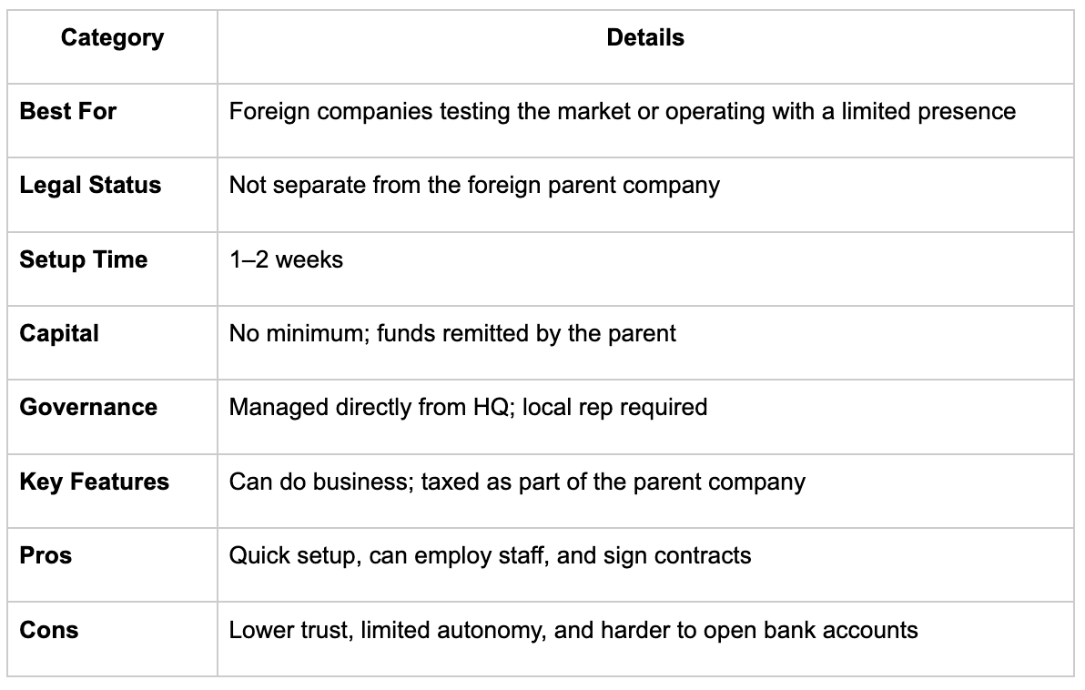Consider a Branch Office if you want to enter the market quickly and validate your business model while remaining under the foreign parent company’s structure.