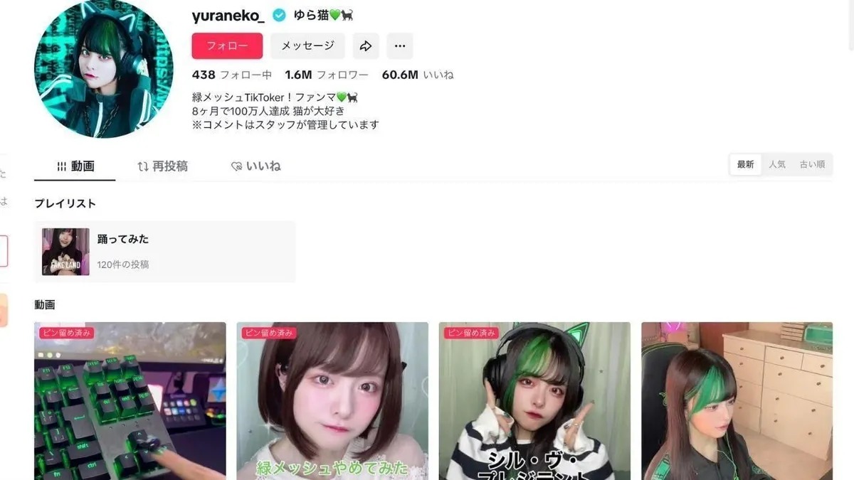 Yuraneko allie sa passion pour les jeux vidéo à des chorégraphies adorables, se créant ainsi une niche unique sur TikTok. Reconnaissable à ses cheveux noirs rehaussés de mèches vertes, elle est aussi talentueuse que facilement identifiable. Jouant plus de 8 heures par jour, Yuraneko est très impliquée dans la communauté des joueurs et séduit un public plus large grâce à son charme naturel.