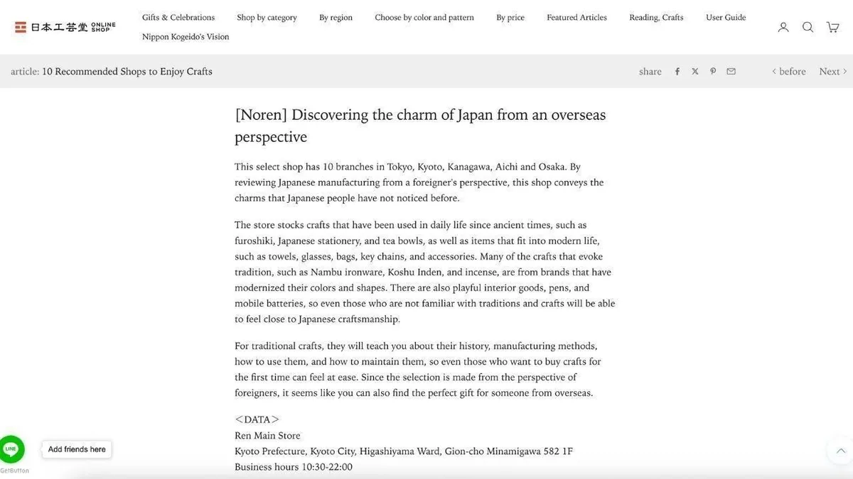 Selon le site web de Nihon Kogei-do, Noren est une boutique sélective comptant dix points de vente principalement à Tokyo et Kyoto, ainsi qu'à Kanagawa, Aichi et Osaka.