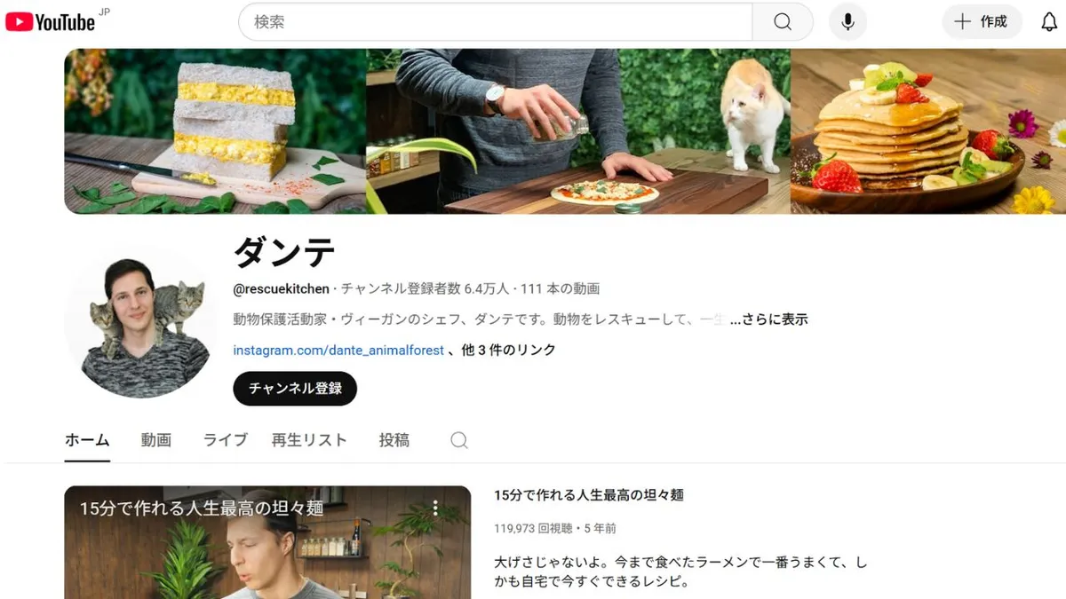 Connu sous le nom de Dante, ce chef végan et défenseur des animaux basé à Okinawa partage des recettes véganes simples et accessibles, ainsi que des tests de produits. Ses vidéos mettent souvent en scène des animaux sauvés, abordent le fitness et proposent des discussions franches sur le véganisme éthique et les alternatives quotidiennes à certains ingrédients. Le style conversationnel et l'authenticité de Dante séduisent particulièrement ceux qui souhaitent adopter un mode de vie végan sans bouleverser leurs habitudes.
