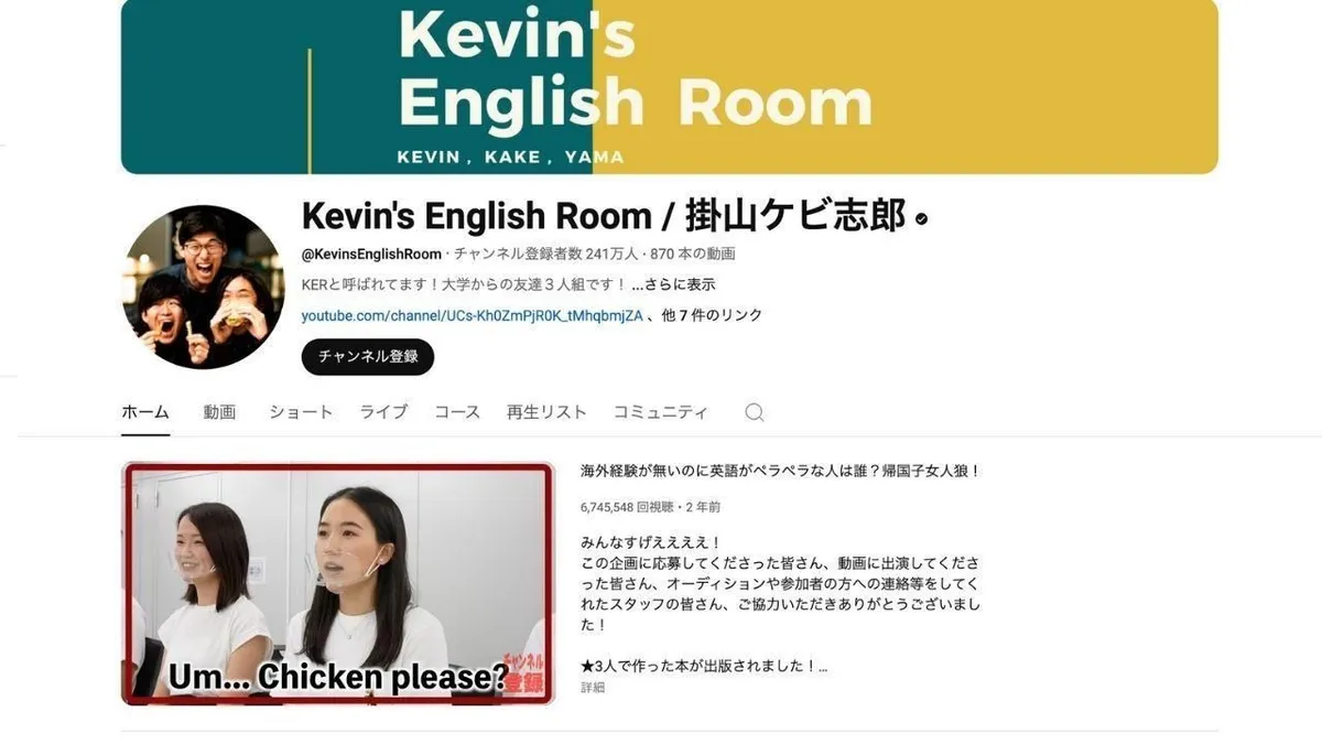 Kevin's English Room est une chaîne YouTube animée par trois amis proches : Kevin, Kake et Yama. Au cœur de cette chaîne se trouve Kevin, anglophone natif et parfaitement bilingue, dont les compétences linguistiques sont à la base d'un contenu accessible et captivant. Dédiée à l'apprentissage de l'anglais, la chaîne aborde une variété de sujets, notamment des conseils de prononciation, des leçons de grammaire et des expressions conversationnelles pratiques. Ce qui la distingue, c'est son intégration créative d'éléments de la culture et de la vie quotidienne japonaises, offrant aux spectateurs une expérience d'apprentissage immersive et authentique.