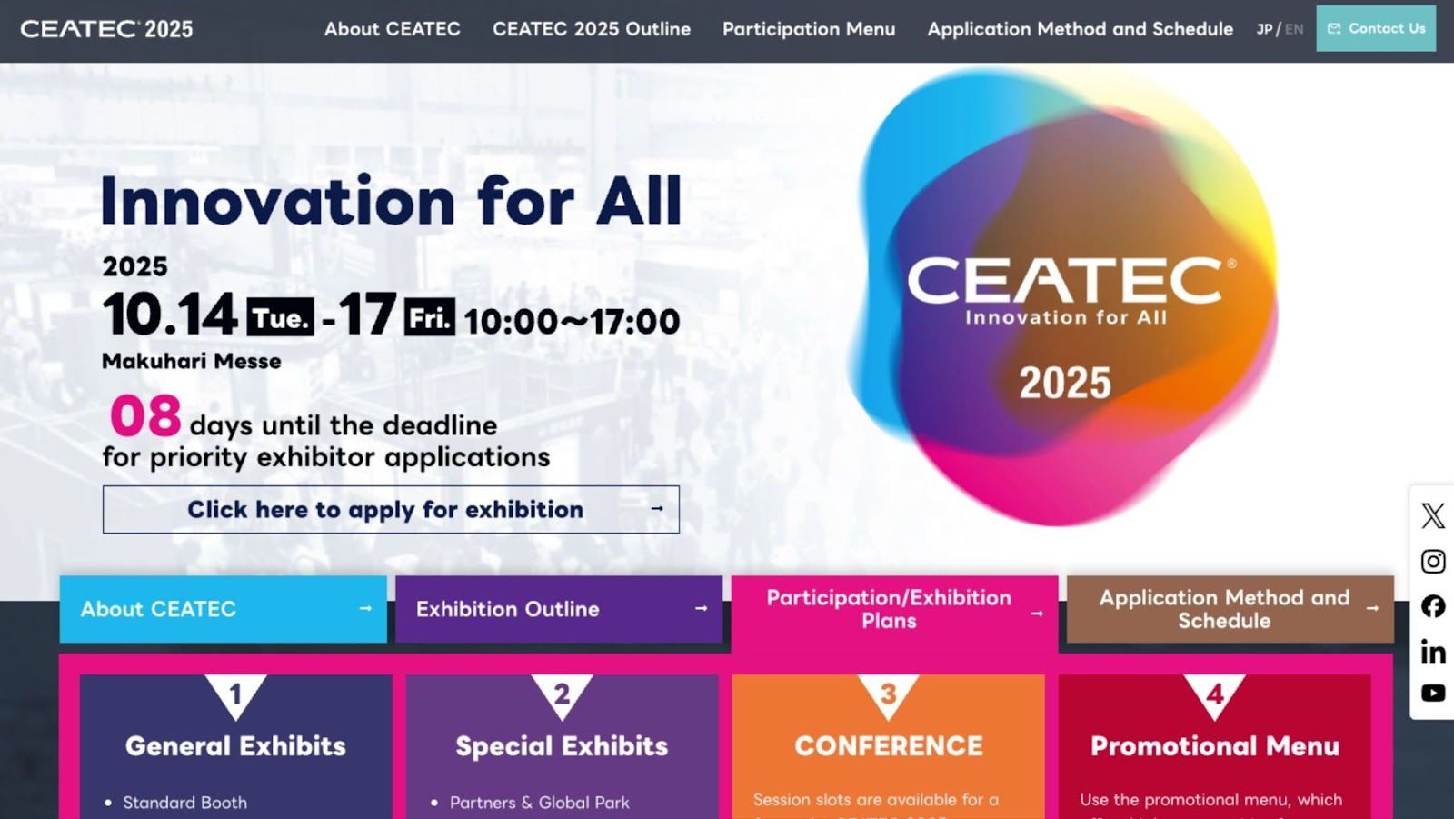 CEATEC은 혁신과 사회적 영향력이 만나는 생태계를 조성함으로써 일반적인 기술 박람회를 뛰어넘습니다. 홍보를 원하는 스타트업, 디지털 정책을 모색하는 정부 기관, 미래를 위한 혁신을 추구하는 기업 등 누구에게나 CEATEC은 협업, 인지도 제고, 아이디어 창출 측면에서 최고의 가치를 제공합니다.