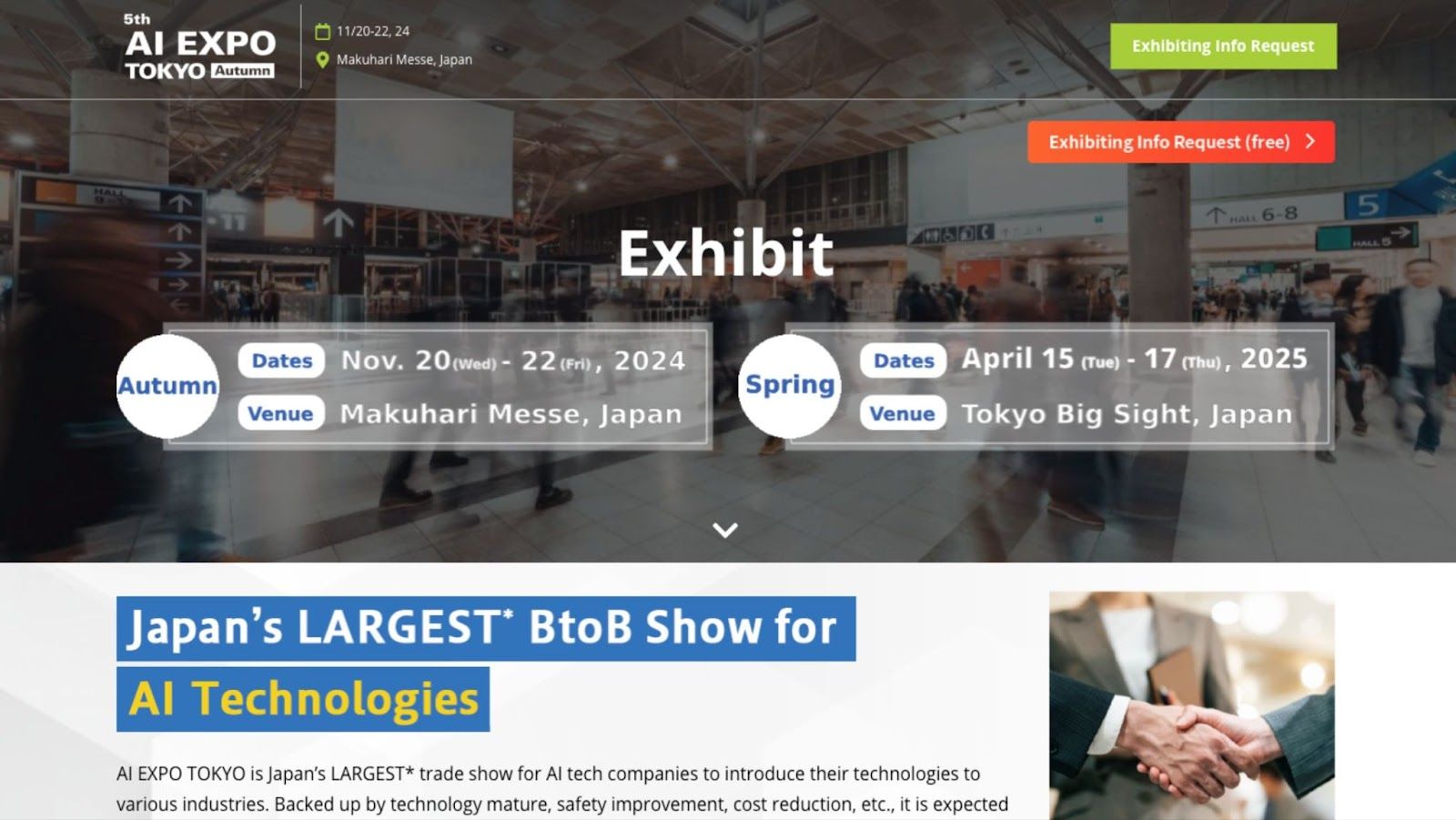 AI 엑스포 도쿄는 특히 눈에 띄는 행사입니다.기업이라면 반드시 참석해야 할 행사AI를 활용한 디지털 전환을 모색하는 기업입니다. 일본의 AI 기반 미래를 만들어가는 인재, 기술, 아이디어에 대한 최고의 접근성을 제공합니다.
