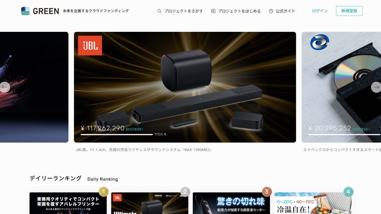 츠타야를 운영하는 컬처 컨비니언스 클럽(CCC)의 지원을 받는 그린 펀딩(GREEN FUNDING)은 2013년에 설립되었으며, 특히 가젯, 오디오 장비, 라이프스타일 액세서리 등 세련되고 고급스러운 제품 캠페인으로 잘 알려져 있습니다. 디자인에 민감한 소비자층을 겨냥하고 있습니다.기술 애호가들.