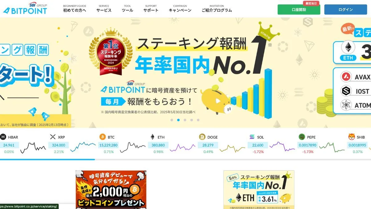 크립토 인사이트 웹사이트에 따르면, BITPOINT는 신규 암호화폐 상장에 중점을 두고 있으며, 거래소와 플랫폼 모두에 접근할 수 있다는 점 등 여러 가지 장점을 제공합니다.직접 구매 서비스대출 서비스를 통한 수익 창출, 일본 엔화로 지급되는 스테이킹 보상, 그리고 정기적으로 진행되는 다양한 프로모션 캠페인 등이 있습니다.