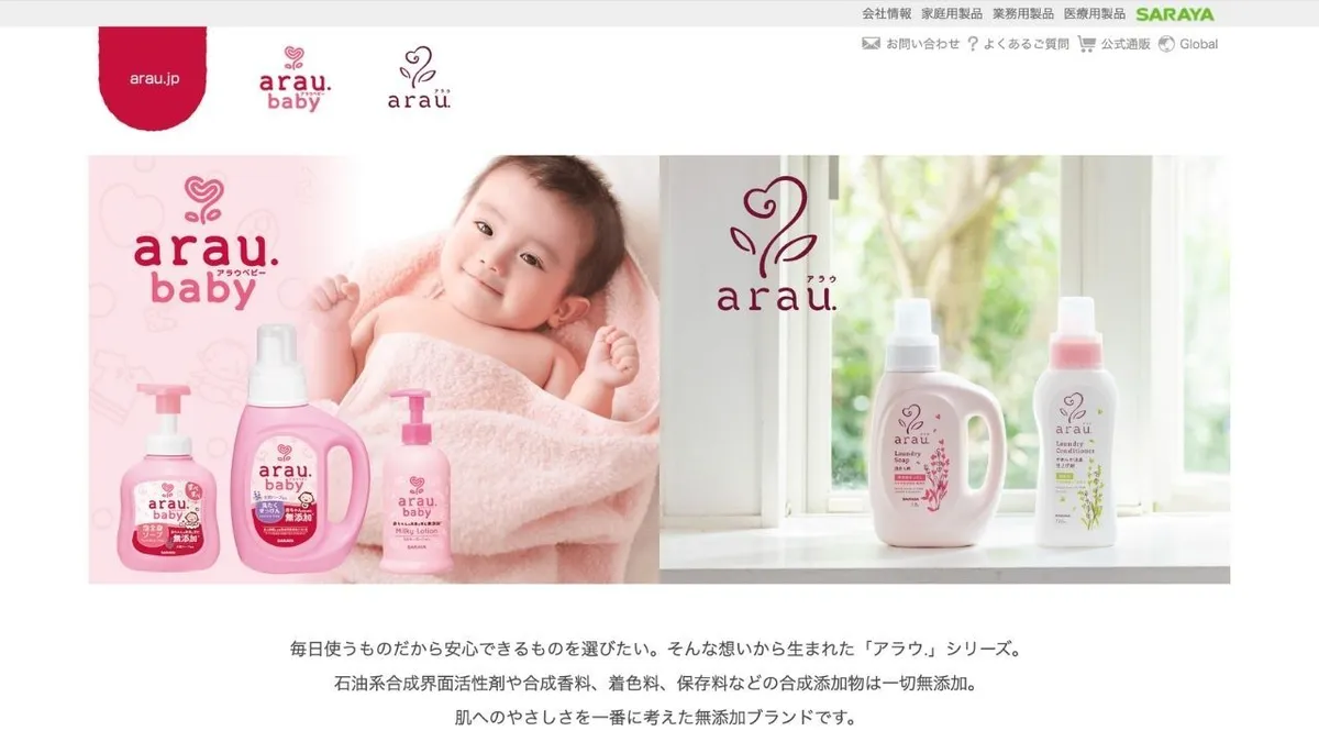 아라우의 일부.2005년 사라야(Saraya)에서 출시한 이 세탁 세제 시리즈는 식물성 성분과 천연 에센셜 오일로 만든 순한 포뮬러로 유명합니다. 아기와 특정 질환을 가진 사람들을 위해 개발되었습니다.민감성 피부첨가물 없이 자연 유래 성분으로 만들어져 특히 어린 자녀를 둔 가정에서 호평을 받고 있습니다. 세심한 포장과 은은한 허브 향으로 자연주의적인 라이프스타일에 잘 어울립니다. 허브의 효능을 이용하여 부드럽게 오염물을 제거합니다.