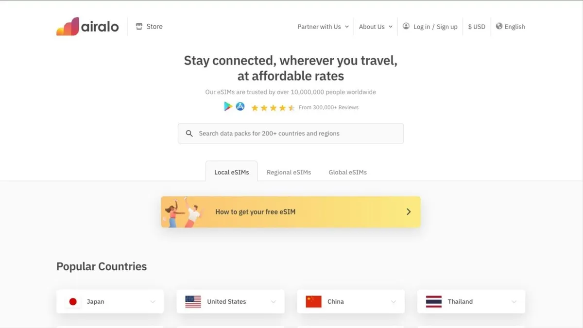 Airalo는 다양한 요금제를 제공하는 글로벌 eSIM 제공업체로, 3일 동안 500MB의 데이터가 포함된 무료 환영 eSIM을 제공합니다. 다른 요금제는 다음과 같습니다.