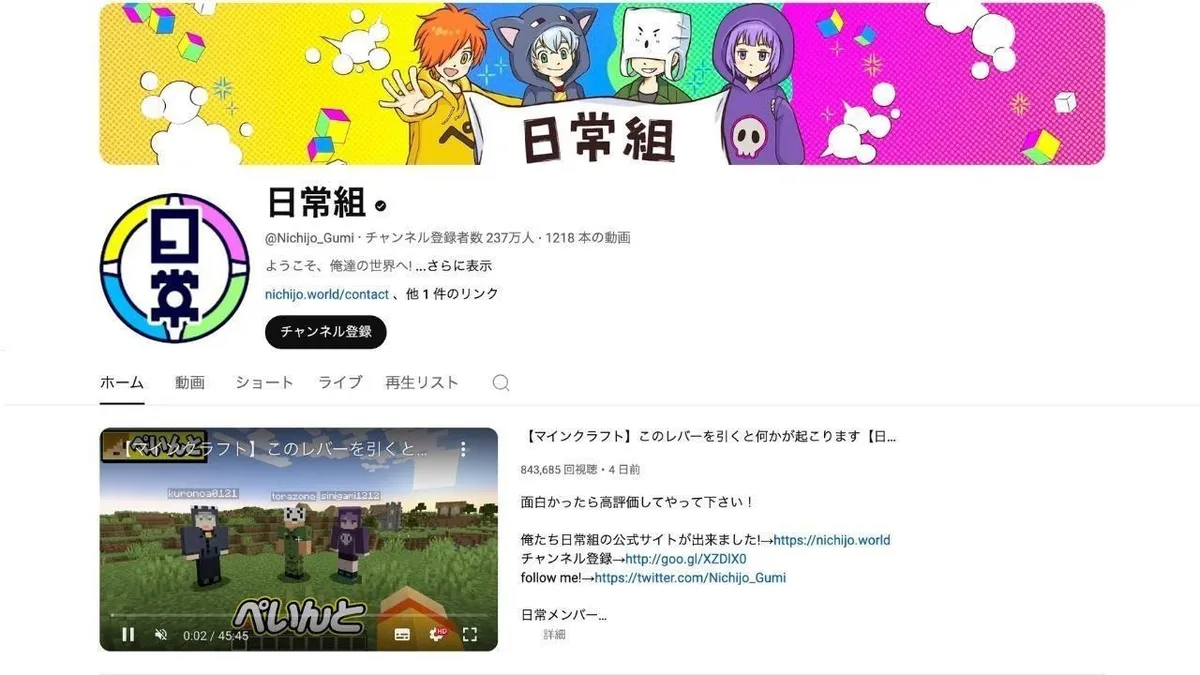 니치조 구미(Nichijo Gumi), 영어로는 데일리 크루(Daily Crew)는 페인트(Paint), 쿠로노아(Kuronoa), 시니가미(Shinigami), 토라조(Torazo) 네 명으로 구성된 일본 게임 해설 그룹입니다. 이들의 채널은 주로 마인크래프트 해설을 다루며, 특히 만화 '니치조 락(Nichijo Lock)'으로도 제작된 인기 시리즈인 '탈옥 시리즈(脱獄シリーズ)'를 비롯한 다양한 시리즈를 소개합니다. 또한 '하쿠추무(Hakuchumu)'와 '라쇼몬(Rashomon)' 등 새로운 시리즈를 정기적으로 소개하며 시청자들에게 다채로운 콘텐츠를 제공하고 있습니다.