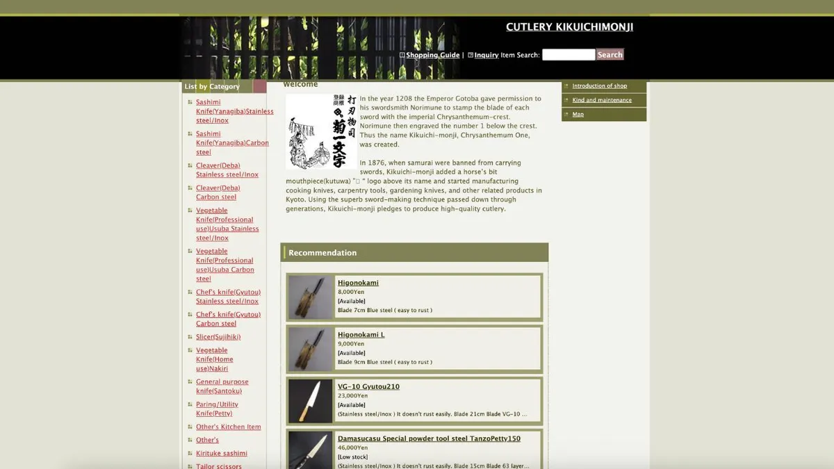 교토에 위치한 키쿠이치몬지는 수 세기의 역사를 자랑하는 유서 깊은 칼 제조업체입니다. 오늘날 키쿠이치몬지는 아리쓰구의 훌륭한 대안으로 널리 인정받으며, 전통적인 탄소강 칼과 현대적인 스테인리스강 칼을 선보이고 있습니다. 특히 스테인리스강 칼은 일본 칼날의 날카로움에 녹 방지 기능까지 더해져 서양 주방에 안성맞춤이기에 해외 구매자들에게 큰 인기를 얻고 있습니다.