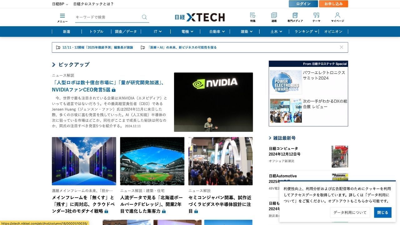 닛케이 BP 주식회사가 운영하는 닛케이 엑스텍은 고품질 콘텐츠로 유명한 최고의 IT 미디어 플랫폼으로, 다음과 같은 분야를 다룹니다.비즈니스 과제닛케이 XTECH는 IT 엔지니어들을 위한 사이트입니다. 기술과 비즈니스의 교차점에 초점을 맞춰 첨단 기술, 전자 제품, 자동차 혁신, 건설 기술, 의료 발전 등 다양한 분야를 포괄적으로 다룹니다. 심층적인 산업 분석과 신기술에 대한 자세한 설명을 통해 최첨단 트렌드에 대한 정보를 얻을 수 있는 중요한 자료 역할을 합니다. 특히 IT 전문가들이 각 분야에서 앞서나가기 위해 필요한 전문적인 콘텐츠를 제공합니다.