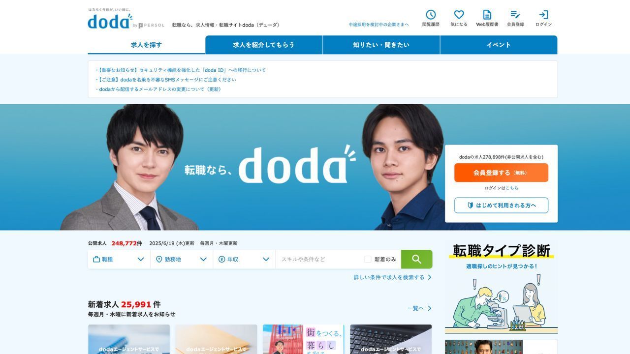 경력을 발전시키고자 하는 모든 분들을 위해직업일본에서 doda는 신뢰할 수 있고 잘 알려진 플랫폼입니다.