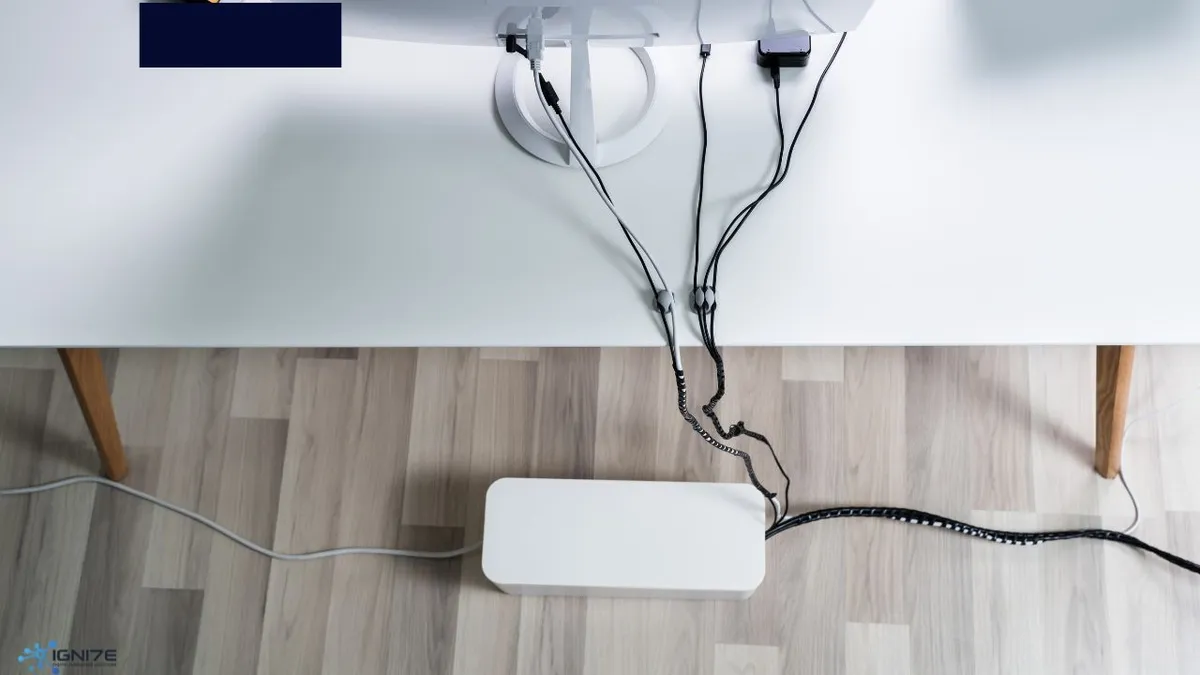 책상 아래 트레이는 멀티탭과 지저분한 케이블을 깔끔하게 정리해 주어 작업 공간을 더욱 깔끔하고 미니멀하게 만들어 줍니다. 케이블 클립이나 정리함은 충전 케이블을 제자리에 고정하고 엉킴을 방지하는 데 도움이 됩니다.