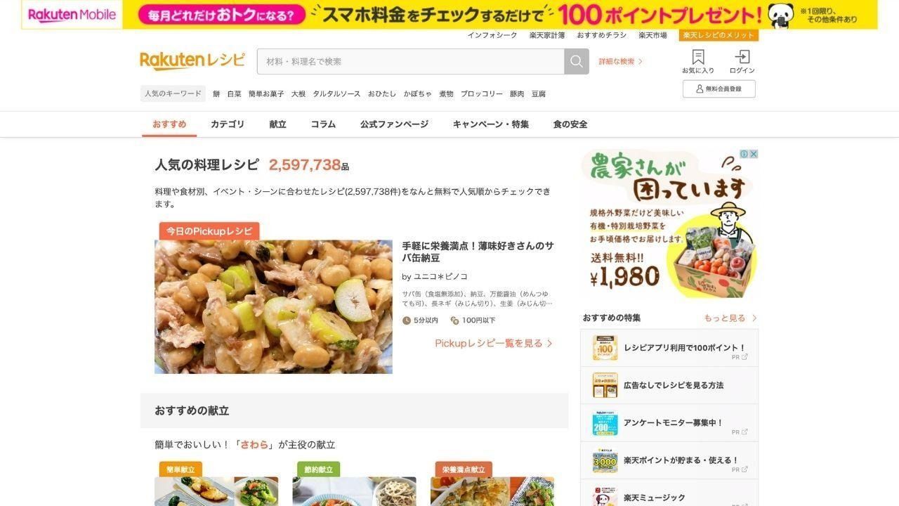 라쿠텐에서 운영하는 라쿠텐 레시피는 다양한 사용자 레시피를 제공합니다. 라쿠텐 회원은 레시피를 공유하여 포인트를 적립할 수 있으며, 활발한 커뮤니티가 형성되어 있습니다. 이 사이트는 실용적이고 따라 하기 쉬운 집밥 레시피를 제공하며, 라쿠텐 이치바를 통해 편리하게 식재료를 구매할 수 있어 레시피 검색과 쇼핑을 한 곳에서 해결할 수 있는 올인원 플랫폼입니다.