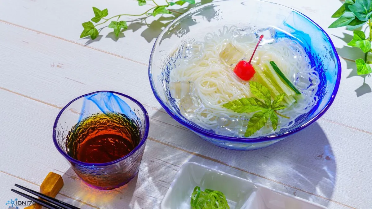 일본의 여름은 덥고 습하기 때문에 시원하고 상쾌한 음식이 필수적입니다.자루 소바대나무 쟁반에 담아 소스와 함께 제공되는 차가운 메밀국수는 가정과 식당 모두에서 흔히 볼 수 있는 음식입니다. 또 다른 인기 메뉴는 다음과 같습니다.소멘—가늘고 섬세한 밀면은 보통 담백한 간장 육수와 함께 즐겨 먹습니다. 가족들은 이 국수를 함께 먹으며 축하하기도 합니다.나가시 소멘국수가 차가운 물이 흐르는 대나무 미끄럼틀을 따라 흘러내려가고 젓가락으로 건져 먹는 모습은 여름 식사에 놀이 요소를 더해줍니다.히야시추카얇게 썬 오이, 햄, 계란, 토마토를 얹은 차가운 라면 요리인 라면 역시 계절에 따라 인기를 누리며 다채로운 색감을 제공합니다.균형 잡힌 식사여름의 풍요로움을 반영하는 것.