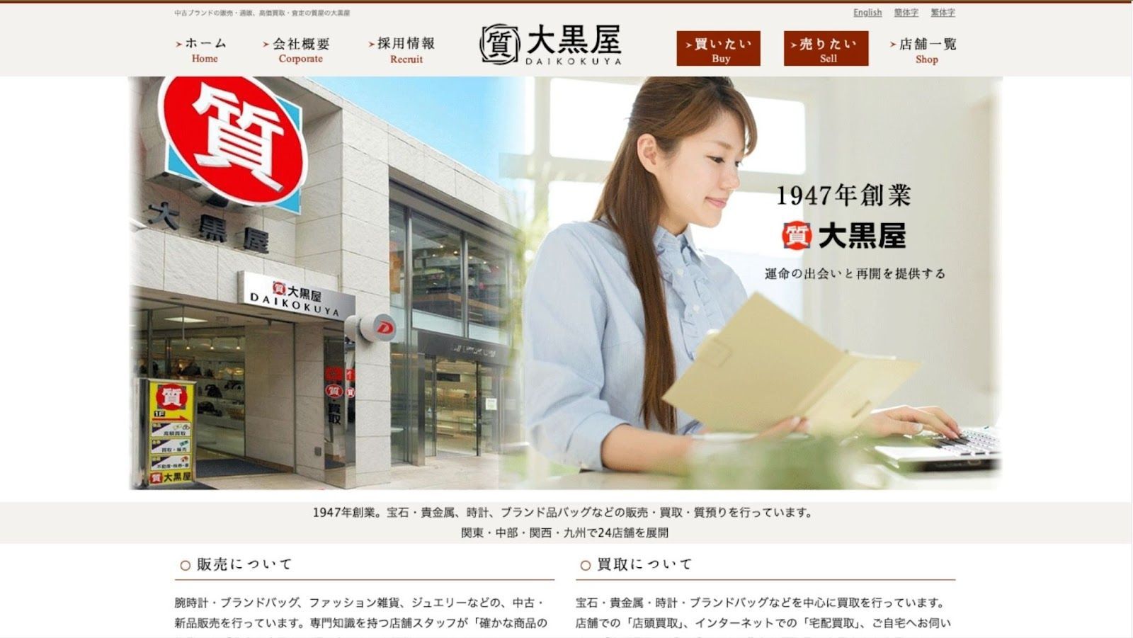 1947년 설립된 다이코쿠야는 일본 중고 명품 시장에서 오랜 역사를 자랑하는 기업입니다. 귀금속, 시계, 브랜드 제품, 보석류 등 명품의 매입, 판매, 담보대출을 전문으로 하며, 간토 지방부터 규슈까지 일본 전역에 24개 이상의 매장을 운영하고 있습니다. 2024년에는 메르카리와 제휴하여 앱을 통한 브랜드 상품 매입 서비스를 시작하며 사업 영역을 확장했습니다. 많은 매장에서 다국어 서비스를 제공하는 다이코쿠야는 국내외 고객 모두에게 서비스를 제공하며 업계에서 신뢰받는 기업으로 자리매김하고 있습니다.