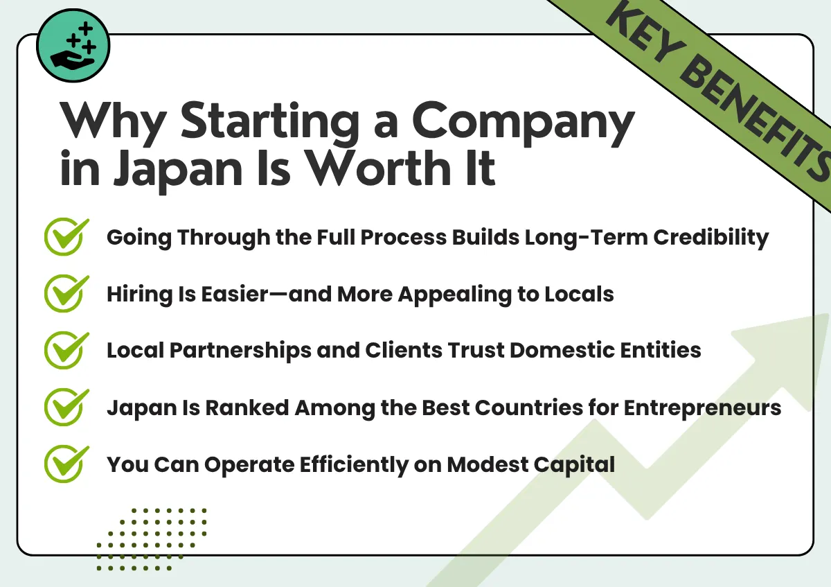 일본에서 사업을 시작하는 과정이 관료적이고 시간이 많이 걸리는 것처럼 보일 수 있지만, 정식 회사 등록 절차를 거치는 것은 특히 일본 시장에서 장기적인 성공을 진지하게 고려한다면 분명하고 지속적인 이점을 가져다줍니다. 일본은 단순히 제품을 판매하는 곳이 아니라, 지속 가능한 사업을 구축하고, 직원을 고용하고, 성장시킬 수 있는 곳입니다.