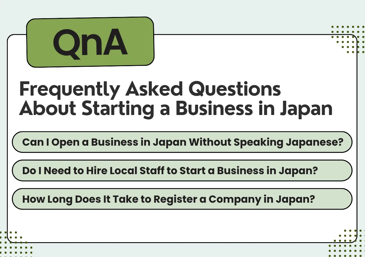 일본에서 사업을 시작하는 데 관심이 있으신가요? 이 FAQ 섹션에서는 외국인 기업가들이 가장 궁금해하는 세 가지 질문에 대한 답변을 제공합니다. 일본어를 못해도 일본에서 사업을 시작할 수 있는지, 현지 직원을 고용해야 하는지, 그리고 일본 기업 등록에는 얼마나 걸리는지 알아보세요. 이 답변들은 법적 요건과 필요한 준비 사항에 대한 중요한 정보를 제공하여, 여러분이 자신감 있게 사업 과정을 진행할 수 있도록 도와줍니다. 일본에 회사를 설립하거나 사업 기회를 모색하려는 경우, 이러한 기본 사항을 이해하는 것은 성공적인 창업 여정에 매우 중요합니다.