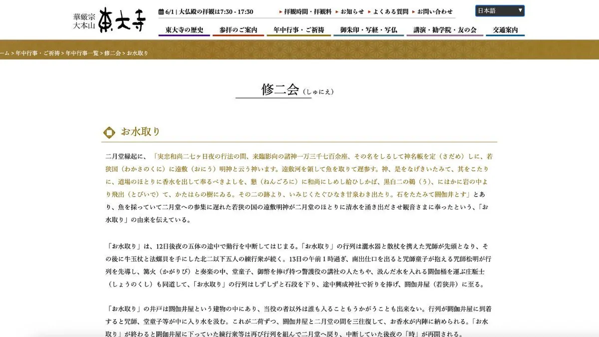 나라현의 유서 깊은 도다이지 절에서 열리는 오미즈토리(七宗師)는 1,200년이 넘는 역사를 자랑하는 불교 행사입니다. 2주간 진행되는 슈니에(隊宗) 의식의 마지막 순서인 이 행사의 하이라이트는 저녁에 열리는 불 의식입니다. 승려들이 거대한 횃불을 사찰 발코니 위로 흔들며 죄를 씻고 행운을 기원하는 의식입니다. 의례적인 분위기와 고풍스러운 풍경이 어우러져 잊을 수 없는 경험을 선사합니다.
