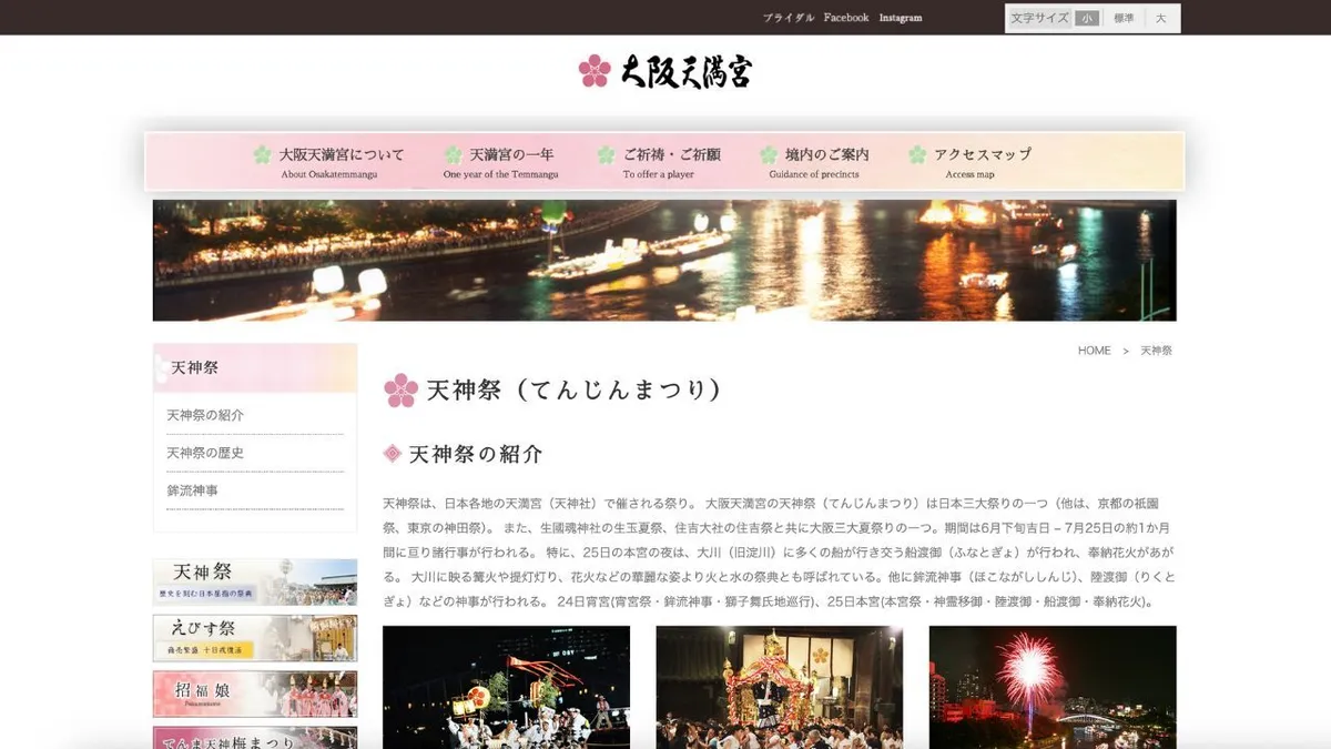 텐진 마쓰리(천신 축제)는 일본 전역의 텐만구 신사에서 매년 25일경에 개최되며, 개최 날짜는 지역에 따라 다릅니다. 오사카 텐만구 신사에서 열리는 오사카 텐진 마쓰리는 가장 규모가 크며, 교토의 기온 마쓰리, 도쿄의 간다 마쓰리와 함께 일본 3대 신토 축제로 꼽힙니다. 원래는 스가와라노 미치자네의 영혼을 달래기 위해 시작되었으며, 이후 스가와라노 미치자네는 천둥의 신 텐진과 연관되게 되었습니다. 오늘날 텐진 마쓰리는 오사카 여름 축제의 핵심 행사입니다. 축제에서는 육상 행렬과 100척이 넘는 배가 참여하는 장엄한 수상 행렬이 펼쳐지며, 화려한 불꽃놀이로 절정을 이룹니다. 오카와 강에 비치는 불꽃의 아름다운 모습 때문에 '불과 물의 축제'라는 별칭을 얻었습니다.