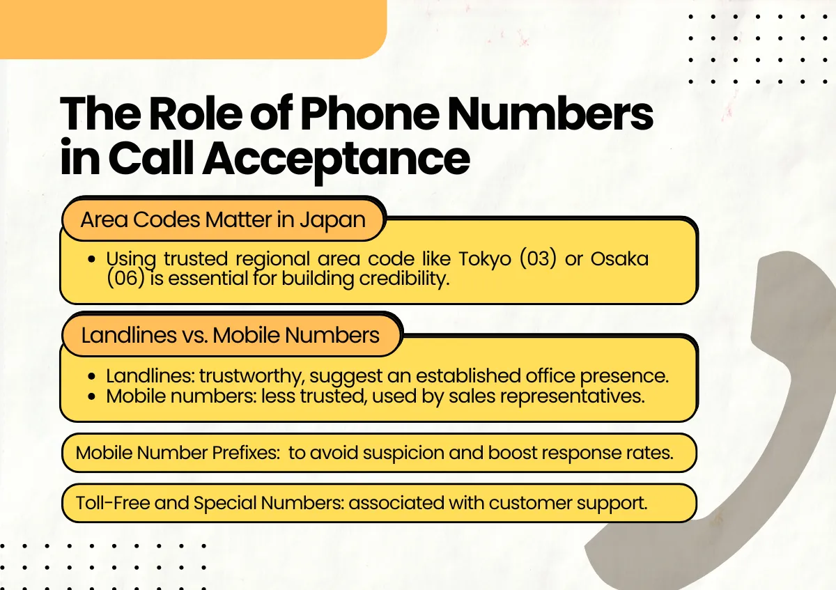 | Local Numbers | 03 (Tokyo), 06 (Osaka), etc. → trusted & seen as local presence | Area codes exist but have little influence today |