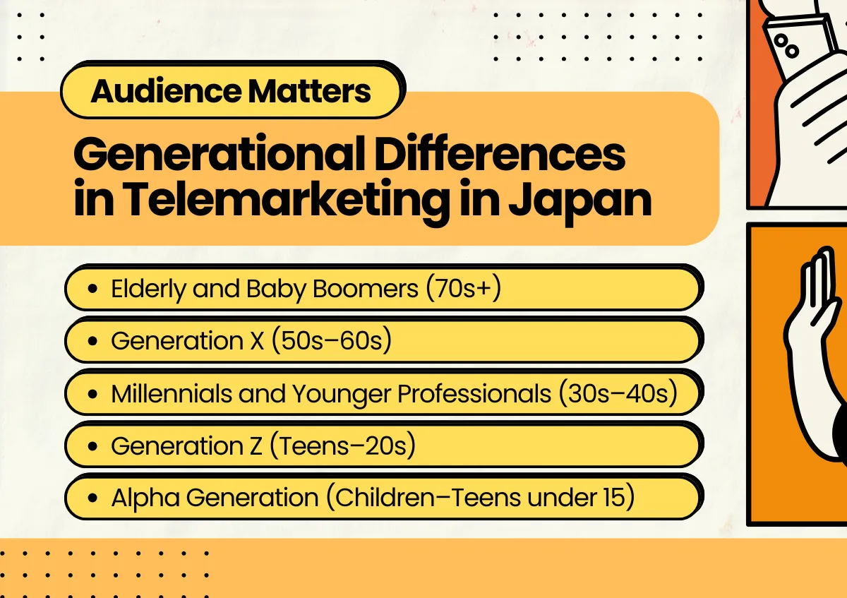일본의 Z세대는 완전한 디지털 환경, 모바일 우선 환경에서 성장했습니다. 그들은 모르는 번호로 걸려온 전화를 거의 받지 않으며, 무작위 전화 통화를 불쾌하게 여길 수 있습니다. 대신, 그들은 상호작용적이고 시각적이며 소셜 미디어 기반의 커뮤니케이션을 기대합니다. 이 세대에게 텔레마케팅은 소셜 증거(인플루언서, 리뷰)와 디지털 후속 조치가 함께 이루어질 때만 효과적입니다.