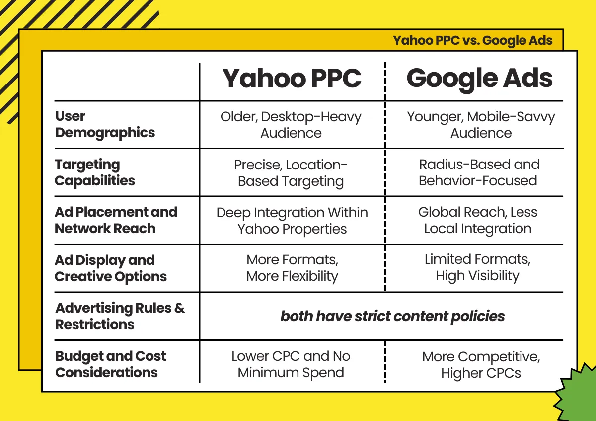 - 구글 광고는 특히 모바일 우선 캠페인이나 글로벌 규모 캠페인에 여전히 유용합니다. 하지만 야후 PPC는 문화적 차이, 지리적 정확성, 그리고 현지 신뢰도가 캠페인 성공의 핵심 요소인 환경에서 탁월한 성능을 발휘합니다.